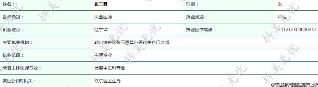 主要執(zhí)業(yè)機(jī)構(gòu):鞍山鐵東區(qū)張玉霞星范醫(yī)療美容門診部