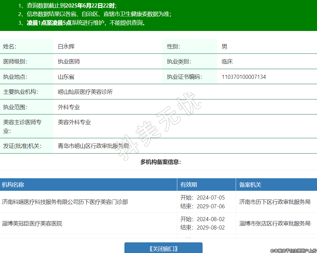 姓名:白永輝性別:男醫(yī)師級(jí)別:執(zhí)業(yè)醫(yī)師執(zhí)業(yè)類別:臨床執(zhí)業(yè)地點(diǎn):山東省執(zhí)業(yè)證書編碼:110370100007134主要執(zhí)業(yè)機(jī)構(gòu):嶗山燦辰醫(yī)療美容診所執(zhí)業(yè)范圍:外科專業(yè)美容主診醫(yī)師專業(yè):美容外科專業(yè)發(fā)證(批準(zhǔn))機(jī)關(guān):青島市嶗山區(qū)行政審批服務(wù)局多機(jī)構(gòu)備案信息:機(jī)構(gòu)名稱 有效期 備案機(jī)關(guān) 濟(jì)南科婳醫(yī)療科技服務(wù)有限公司歷下醫(yī)療美容門診部 開始:2024-07-05結(jié)束:2029-07-06濟(jì)南市歷下區(qū)行政審批服務(wù)局 淄博美冠臣醫(yī)療美容醫(yī)院 開始:2024-08-02結(jié)束:2029-08-02淄博市張店區(qū)行政審批服務(wù)局 華美創(chuàng)和醫(yī)療美容(濟(jì)南)有限公司華美創(chuàng)和醫(yī)療美容門診部 開始:2024-08-05結(jié)束:2029-08-06濟(jì)南市市中區(qū)衛(wèi)生健康局 -