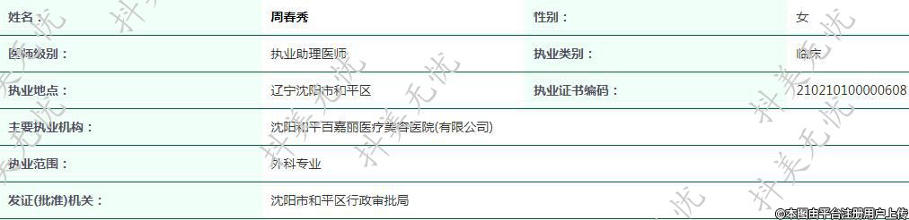 主要執(zhí)業(yè)機構(gòu):沈陽和平百嘉麗醫(yī)療美容醫(yī)院(有限公司)