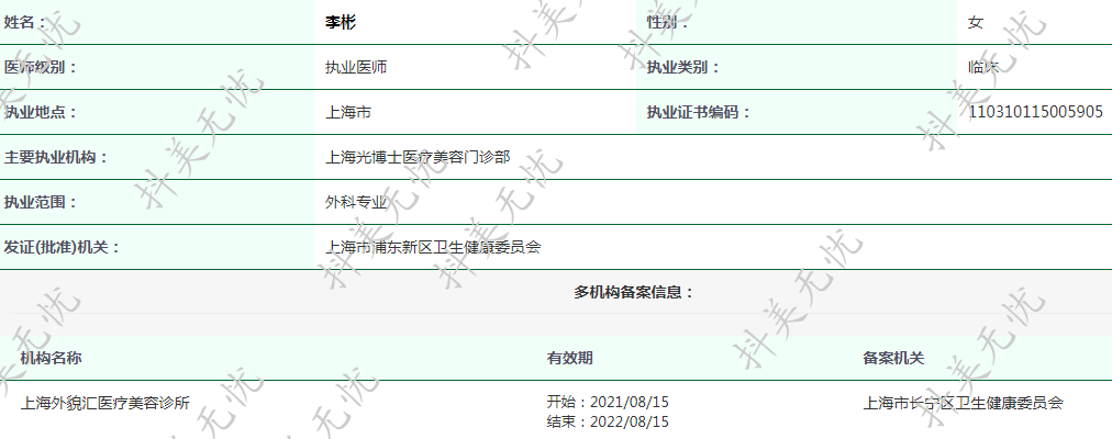 主要執(zhí)業(yè)機(jī)構(gòu):上海光博士醫(yī)療美容門(mén)診部