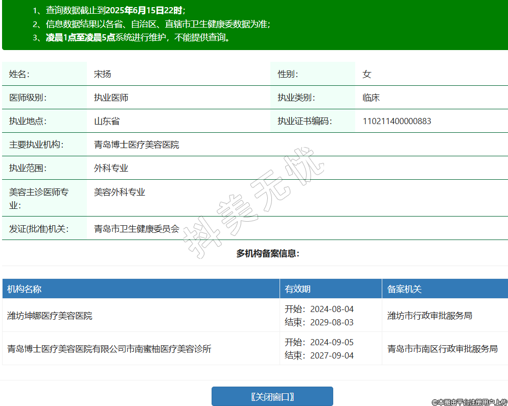 姓名:宋揚性別:女醫(yī)師級別:執(zhí)業(yè)醫(yī)師執(zhí)業(yè)類別:臨床執(zhí)業(yè)地點:山東省執(zhí)業(yè)證書編碼:110211400000883主要執(zhí)業(yè)機構(gòu):青島博士醫(yī)療美容醫(yī)院執(zhí)業(yè)范圍:外科專業(yè)美容主診醫(yī)師專業(yè):美容外科專業(yè)發(fā)證(批準(zhǔn))機關(guān):青島市衛(wèi)生健康委員會多機構(gòu)備案信息:機構(gòu)名稱 有效期 備案機關(guān) 濰坊坤娜醫(yī)療美容醫(yī)院 開始:2024-08-04結(jié)束:2029-08-03濰坊市行政審批服務(wù)局 青島博士醫(yī)療美容醫(yī)院有限公司市南蜜柚醫(yī)療美容診所 開始:2024-09-05結(jié)束:2027-09-04青島市市南區(qū)行政審批服務(wù)局 -