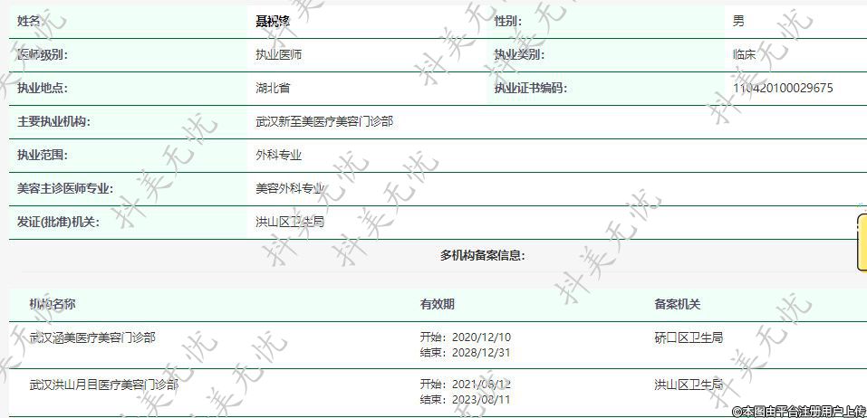 主要執(zhí)業(yè)機(jī)構(gòu):武漢新至美醫(yī)療美容門診部