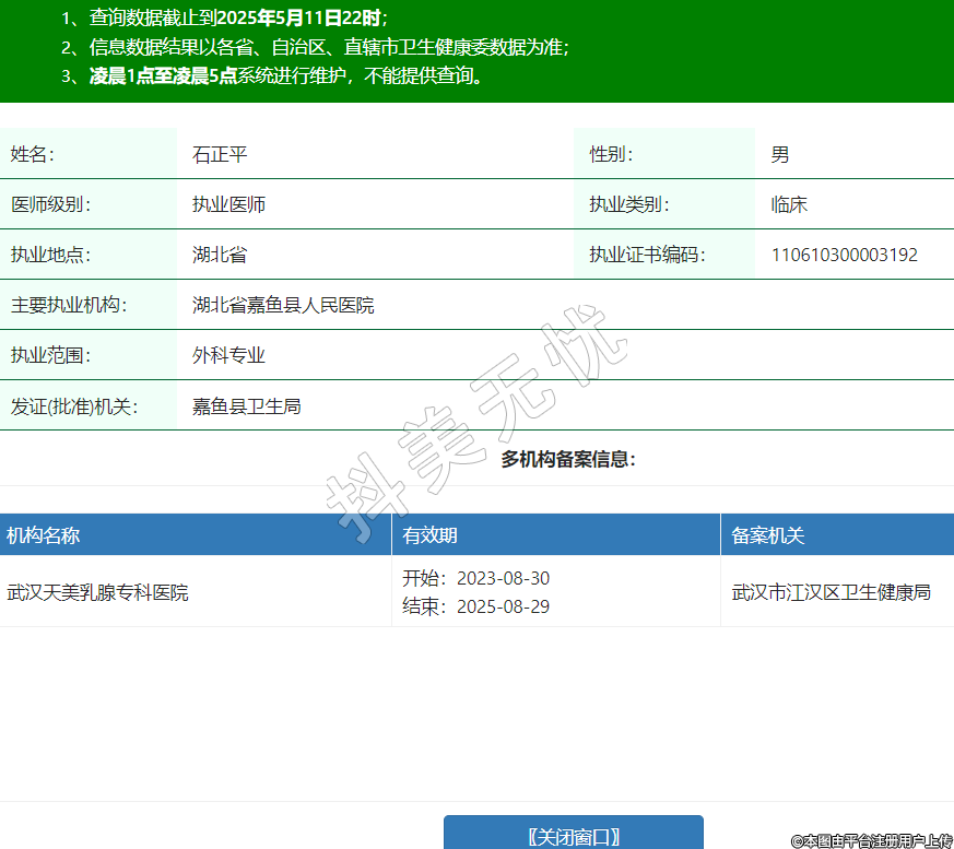 姓名:石正平性別:男醫(yī)師級別:執(zhí)業(yè)醫(yī)師執(zhí)業(yè)類別:臨床執(zhí)業(yè)地點:湖北省執(zhí)業(yè)證書編碼:110610300003192主要執(zhí)業(yè)機構(gòu):湖北省嘉魚縣人民醫(yī)院執(zhí)業(yè)范圍:外科專業(yè)發(fā)證(批準)機關(guān):嘉魚縣衛(wèi)生局多機構(gòu)備案信息:機構(gòu)名稱 有效期 備案機關(guān) 武漢天美乳腺??漆t(yī)院 開始:2023-08-30結(jié)束:2025-08-29武漢市江漢區(qū)衛(wèi)生健康局 -