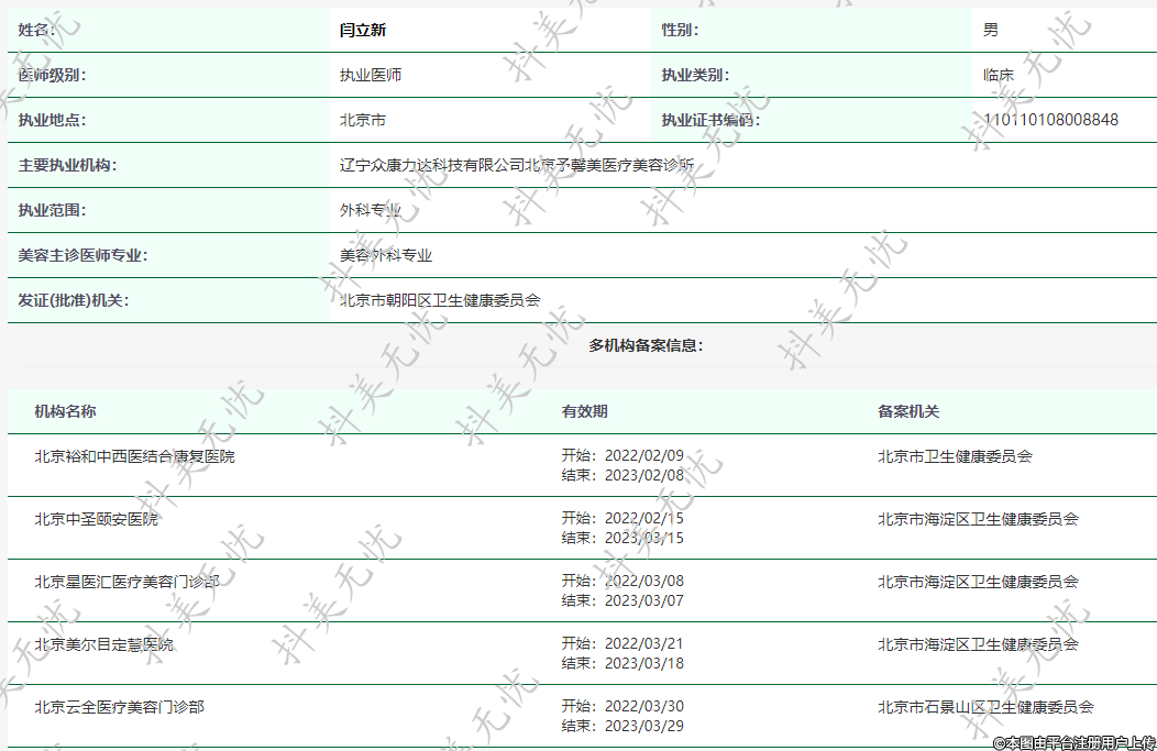 主要執(zhí)業(yè)機(jī)構(gòu):遼寧眾康力達(dá)科技有限公司北京予馨美醫(yī)療美容診所
