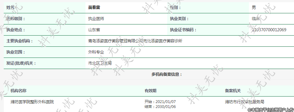 主要執(zhí)業(yè)機構(gòu):青島添姿醫(yī)療美容管理有限公司市北添姿醫(yī)療美容診所