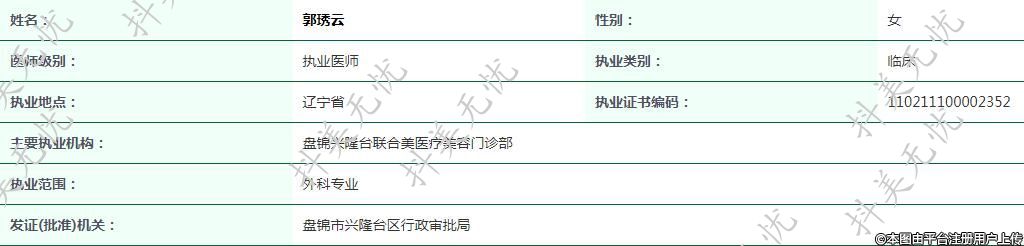 主要執(zhí)業(yè)機(jī)構(gòu):盤錦興隆臺(tái)聯(lián)合美醫(yī)療美容門診部