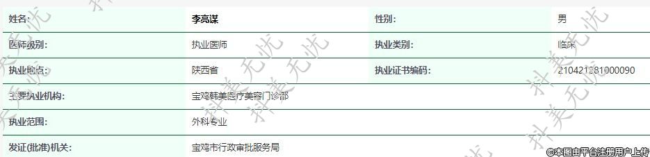 主要執(zhí)業(yè)機構:寶雞韓美醫(yī)療美容門診部