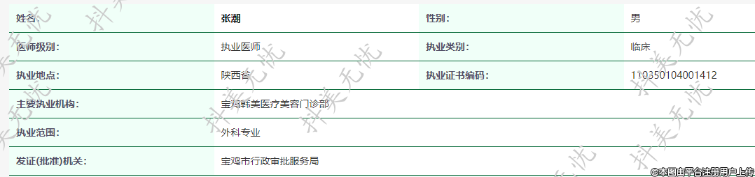 主要執(zhí)業(yè)機構:寶雞韓美醫(yī)療美容門診部
