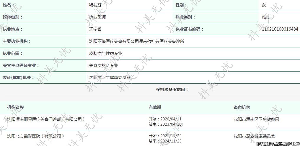 主要執(zhí)業(yè)機構:沈陽麗格醫(yī)療美容有限公司渾南穆桂芬醫(yī)療美容診所