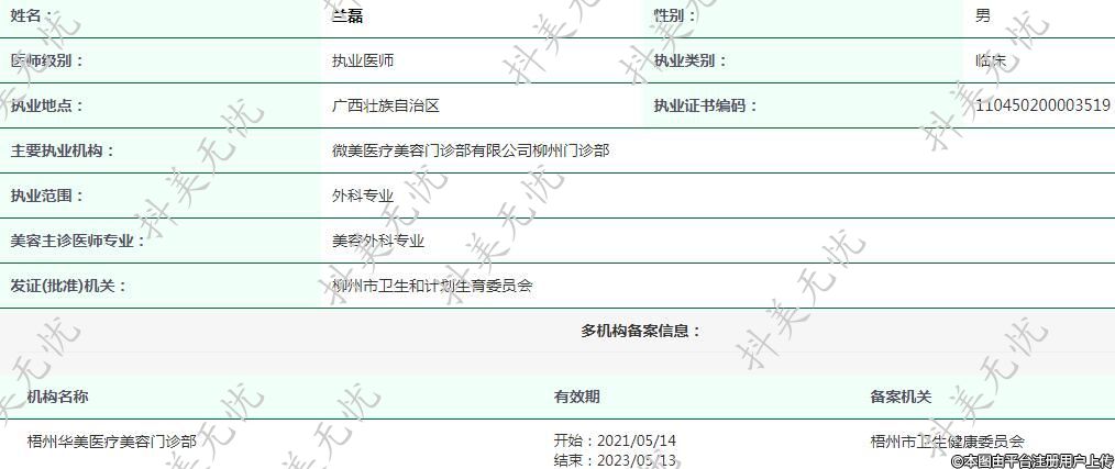 主要執(zhí)業(yè)機構(gòu):微美醫(yī)療美容門診部有限公司柳州門診部