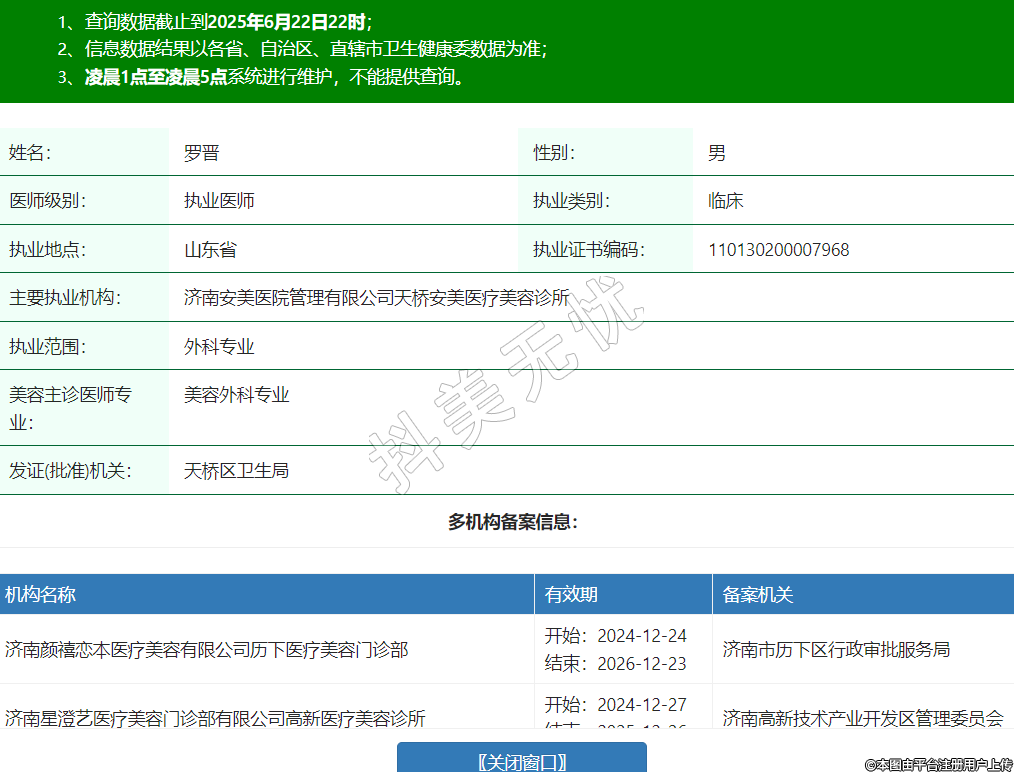 姓名:羅晉性別:男醫(yī)師級別:執(zhí)業(yè)醫(yī)師執(zhí)業(yè)類別:臨床執(zhí)業(yè)地點:山東省執(zhí)業(yè)證書編碼:110130200007968主要執(zhí)業(yè)機構(gòu):濟南安美醫(yī)院管理有限公司天橋安美醫(yī)療美容診所執(zhí)業(yè)范圍:外科專業(yè)美容主診醫(yī)師專業(yè):美容外科專業(yè)發(fā)證(批準)機關(guān):天橋區(qū)衛(wèi)生局多機構(gòu)備案信息:機構(gòu)名稱 有效期 備案機關(guān) 濟南顏禧戀本醫(yī)療美容有限公司歷下醫(yī)療美容門診部 開始:2024-12-24結(jié)束:2026-12-23濟南市歷下區(qū)行政審批服務(wù)局 濟南星澄藝醫(yī)療美容門診部有限公司高新醫(yī)療美容診所 開始:2024-12-27結(jié)束:2025-12-26濟南高新技術(shù)產(chǎn)業(yè)開發(fā)區(qū)管理委員會 淄博妝典醫(yī)療有限公司張店亞韓醫(yī)療美容門診部 開始:2025-02-13結(jié)束:2026-02-12淄博市張店區(qū)衛(wèi)生健康局 濟南麗合醫(yī)療美容醫(yī)院 開始:2025-03-20結(jié)束:2026-03-19濟南市衛(wèi)生健康委員會 濟南俏嘉麗醫(yī)療美容醫(yī)院有限公司槐蔭俏嘉麗醫(yī)療美容門診部 開始:2025-05-25結(jié)束:2027-05-24濟南市槐蔭區(qū)行政審批服務(wù)局 濟南顏禧匯美美容咨詢有限公司歷下醫(yī)療美容診所 開始:2025-05-28結(jié)束:2026-05-27濟南市歷下區(qū)行政審批服務(wù)局 旭美風尚(濟南)醫(yī)療美容有限公司歷下醫(yī)療美容門診部 開始:2025-05-29結(jié)束:2026-05-28濟南市歷下區(qū)衛(wèi)生健康局 -
