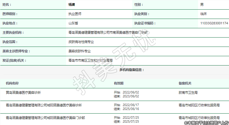 主要執(zhí)業(yè)機構(gòu):青島諾美德健康管理有限公司市南諾美德醫(yī)療美容門診部