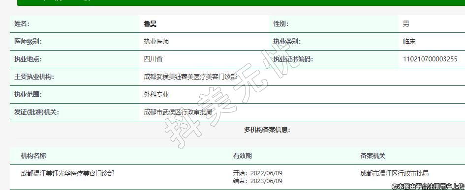 主要執(zhí)業(yè)機構(gòu):成都武侯美鈺蓉美醫(yī)療美容門診部