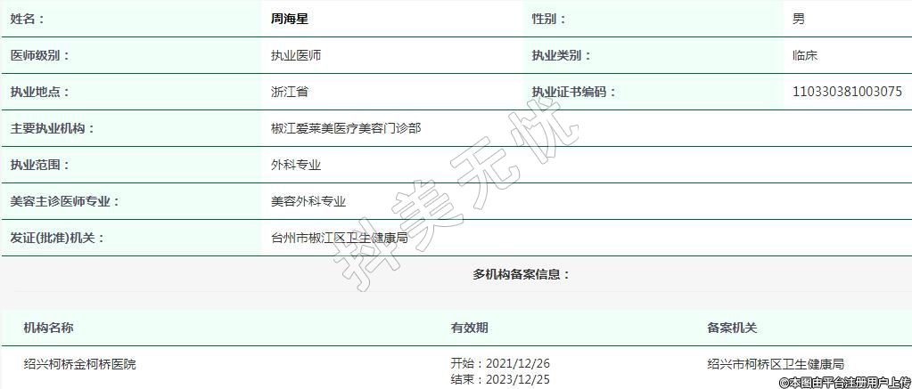 主要執(zhí)業(yè)機(jī)構(gòu):椒江愛(ài)萊美醫(yī)療美容門(mén)診部