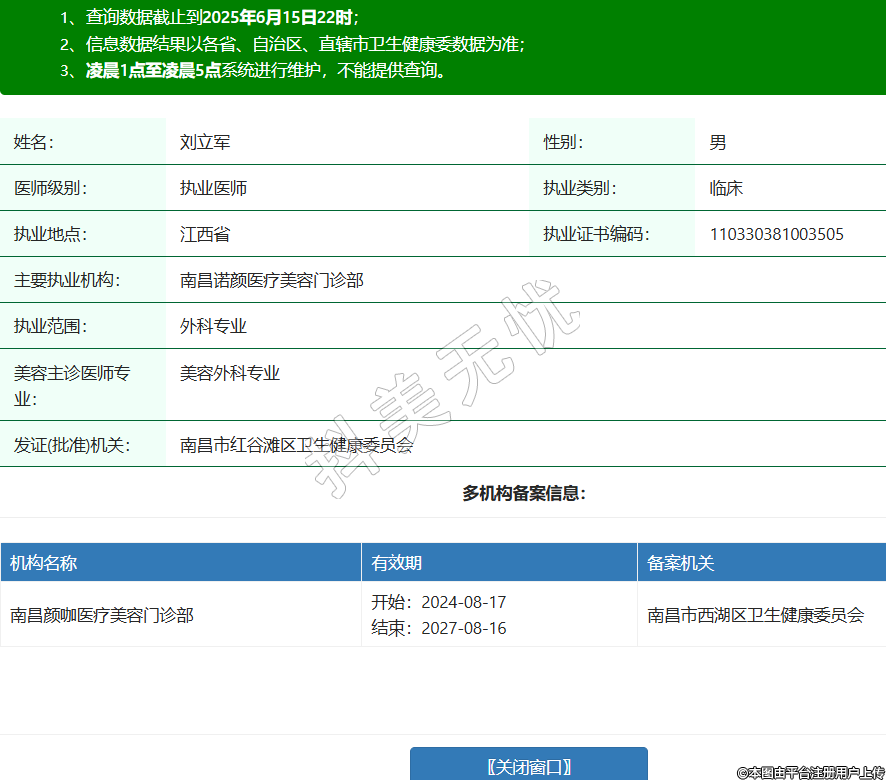 姓名:劉立軍性別:男醫(yī)師級別:執(zhí)業(yè)醫(yī)師執(zhí)業(yè)類別:臨床執(zhí)業(yè)地點(diǎn):江西省執(zhí)業(yè)證書編碼:110330381003505主要執(zhí)業(yè)機(jī)構(gòu):南昌諾顏醫(yī)療美容門診部執(zhí)業(yè)范圍:外科專業(yè)美容主診醫(yī)師專業(yè):美容外科專業(yè)發(fā)證(批準(zhǔn))機(jī)關(guān):南昌市紅谷灘區(qū)衛(wèi)生健康委員會多機(jī)構(gòu)備案信息:機(jī)構(gòu)名稱 有效期 備案機(jī)關(guān) 南昌顏咖醫(yī)療美容門診部 開始:2024-08-17結(jié)束:2027-08-16南昌市西湖區(qū)衛(wèi)生健康委員會 -