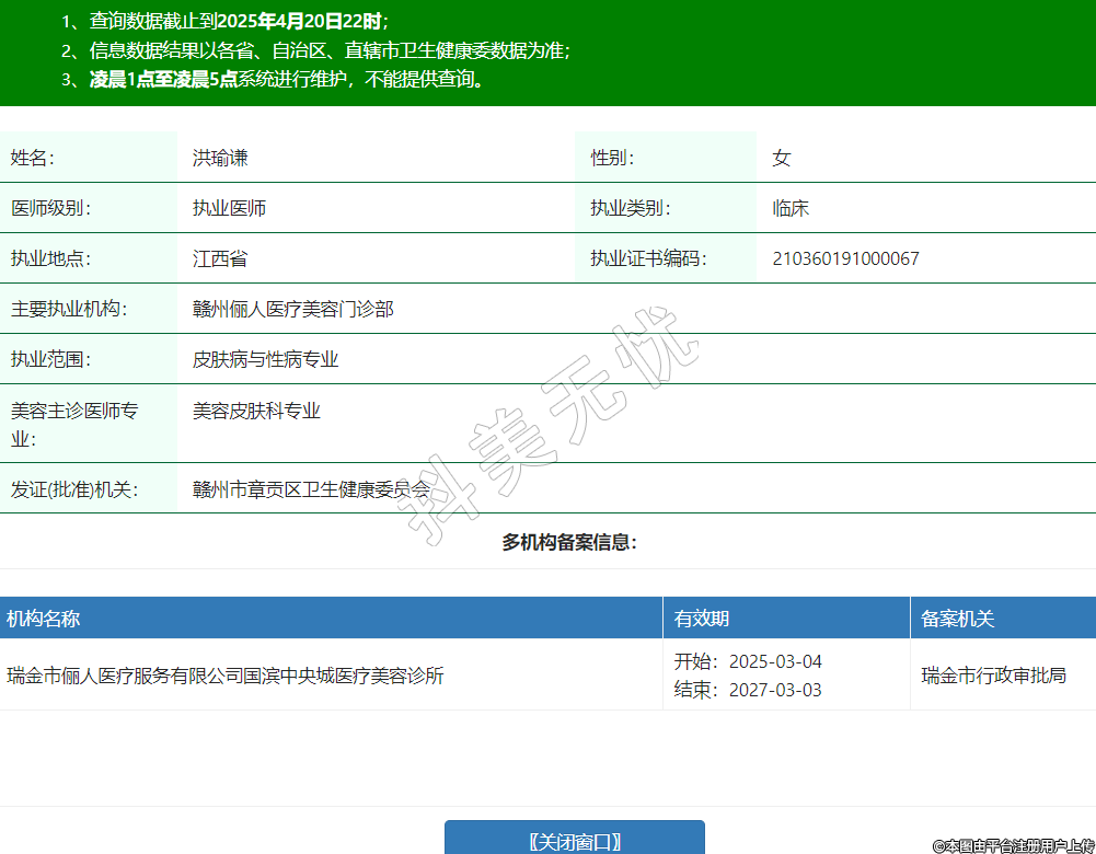姓名:洪瑜謙性別:女醫(yī)師級別:執(zhí)業(yè)醫(yī)師執(zhí)業(yè)類別:臨床執(zhí)業(yè)地點:江西省執(zhí)業(yè)證書編碼:210360191000067主要執(zhí)業(yè)機構:贛州儷人醫(yī)療美容門診部執(zhí)業(yè)范圍:皮膚病與性病專業(yè)美容主診醫(yī)師專業(yè):美容皮膚科專業(yè)發(fā)證(批準)機關:贛州市章貢區(qū)衛(wèi)生健康委員會多機構備案信息:機構名稱 有效期 備案機關 瑞金市儷人醫(yī)療服務有限公司國濱中央城醫(yī)療美容診所 開始:2025-03-04結束:2027-03-03瑞金市行政審批局 -