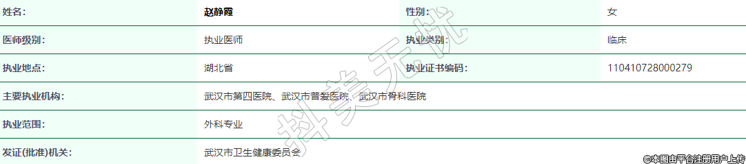 主要執(zhí)業(yè)機構:武漢市第四醫(yī)院、武漢市普愛醫(yī)院、武漢市骨科醫(yī)院