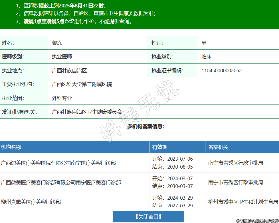 姓名:黎凍性別:男醫(yī)師級(jí)別:執(zhí)業(yè)醫(yī)師執(zhí)業(yè)類別:臨床執(zhí)業(yè)地點(diǎn):廣西壯族自治區(qū)執(zhí)業(yè)證書編碼:110450000002052主要執(zhí)業(yè)機(jī)構(gòu):廣西醫(yī)科大學(xué)第二附屬醫(yī)院執(zhí)業(yè)范圍:外科專業(yè)發(fā)證(批準(zhǔn))機(jī)關(guān):廣西壯族自治區(qū)衛(wèi)生健康委員會(huì)多機(jī)構(gòu)備案信息:機(jī)構(gòu)名稱 有效期 備案機(jī)關(guān) 廣西熠美醫(yī)療美容醫(yī)院有限公司南寧醫(yī)療美容門診部 開(kāi)始:2023-07-06結(jié)束:2030-08-05南寧市青秀區(qū)行政審批局 廣西微美醫(yī)療美容門診部有限公司南寧醫(yī)療美容門診部 開(kāi)始:2024-03-07結(jié)束:2030-03-07南寧市青秀區(qū)行政審批局 柳州真微美醫(yī)療美容門診部 開(kāi)始:2024-03-29結(jié)束:2027-03-29柳州市城中區(qū)衛(wèi)生和計(jì)劃生育局 玉林微美醫(yī)療美容門診有限公司玉林醫(yī)療美容門診部 開(kāi)始:2024-04-23結(jié)束:2027-04-23玉林市衛(wèi)生健康委員會(huì) 貴港市港北區(qū)人民醫(yī)院 開(kāi)始:2024-05-01結(jié)束:2027-05-01貴港市衛(wèi)生健康委員會(huì) 南寧顏值密碼醫(yī)療美容門診部 開(kāi)始:2024-08-26結(jié)束:2034-08-26南寧市青秀區(qū)行政審批局 廣西安和美雅醫(yī)院有限公司南寧綜合門診部 開(kāi)始:2025-06-27結(jié)束:2030-06-26南寧市青秀區(qū)政務(wù)服務(wù)局 廣西亞太醫(yī)療美容醫(yī)院 開(kāi)始:2025-07-23結(jié)束:2030-07-22南寧市政務(wù)服務(wù)局 南寧星范醫(yī)療美容門診部 開(kāi)始:2025-08-12結(jié)束:2035-08-09南寧市青秀區(qū)政務(wù)服務(wù)局 -