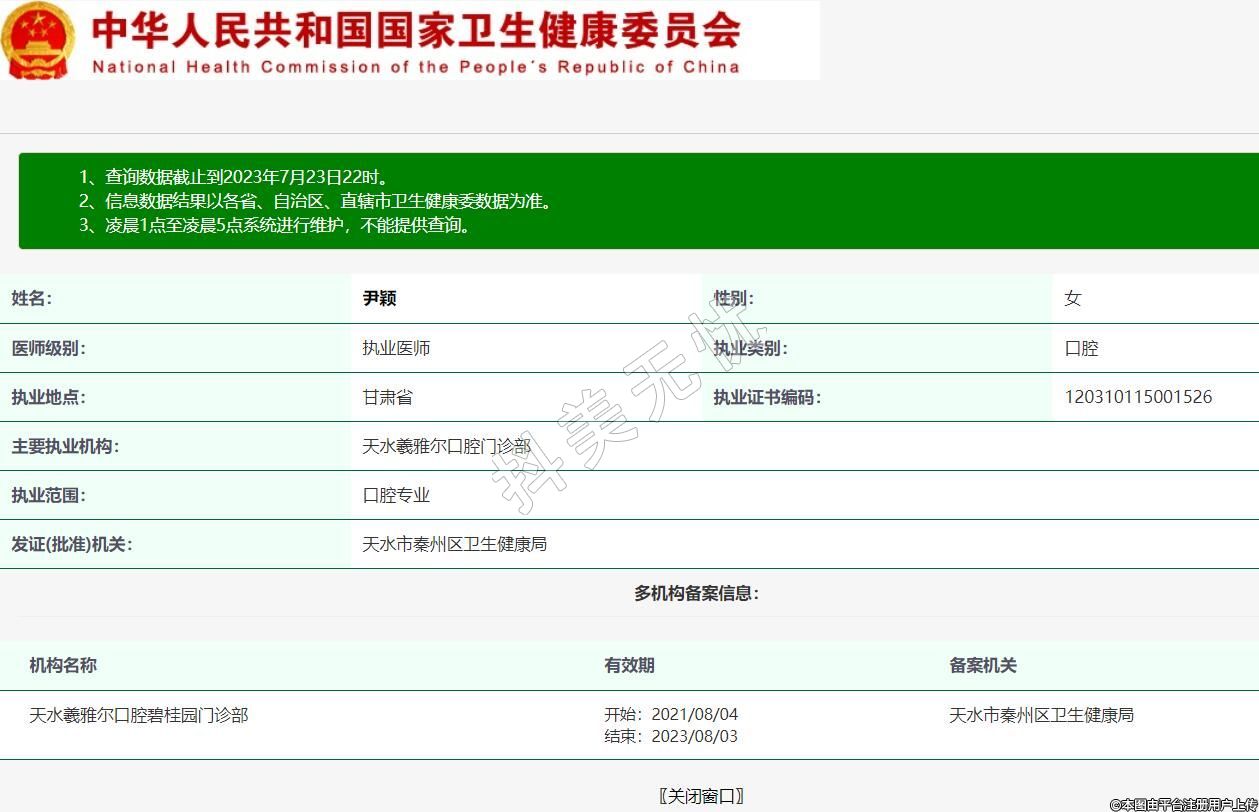 主要執(zhí)業(yè)機(jī)構(gòu):天水羲雅爾口腔門(mén)診部