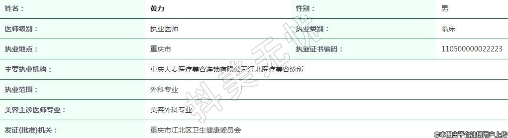 主要執(zhí)業(yè)機(jī)構(gòu):重慶大麥醫(yī)療美容連鎖有限公司江北醫(yī)療美容診所