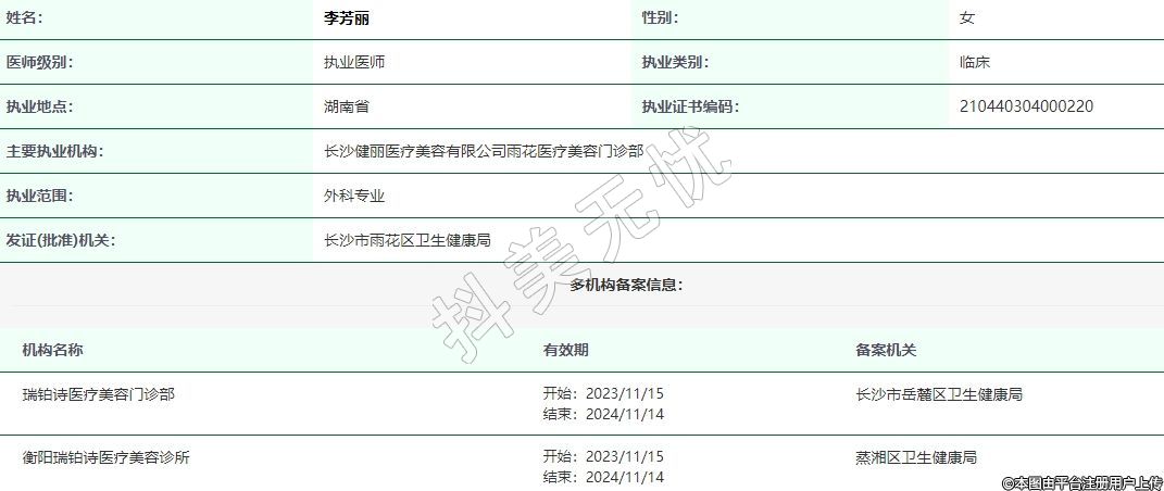 主要執(zhí)業(yè)機(jī)構(gòu):長沙健麗醫(yī)療美容有限公司雨花醫(yī)療美容門診部