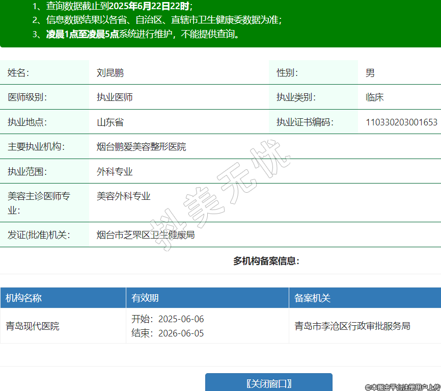 姓名:劉昆鵬性別:男醫(yī)師級(jí)別:執(zhí)業(yè)醫(yī)師執(zhí)業(yè)類別:臨床執(zhí)業(yè)地點(diǎn):山東省執(zhí)業(yè)證書(shū)編碼:110330203001653主要執(zhí)業(yè)機(jī)構(gòu):煙臺(tái)鵬愛(ài)美容整形醫(yī)院執(zhí)業(yè)范圍:外科專業(yè)美容主診醫(yī)師專業(yè):美容外科專業(yè)發(fā)證(批準(zhǔn))機(jī)關(guān):煙臺(tái)市芝罘區(qū)衛(wèi)生健康局多機(jī)構(gòu)備案信息:機(jī)構(gòu)名稱 有效期 備案機(jī)關(guān) 青島現(xiàn)代醫(yī)院 開(kāi)始:2025-06-06結(jié)束:2026-06-05青島市李滄區(qū)行政審批服務(wù)局 -