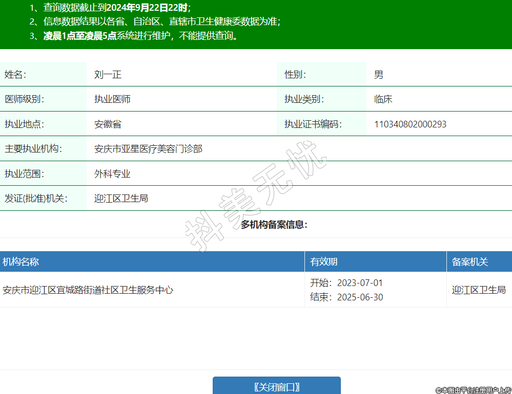 主要執(zhí)業(yè)機(jī)構(gòu):安慶市亞星醫(yī)療美容門(mén)診部