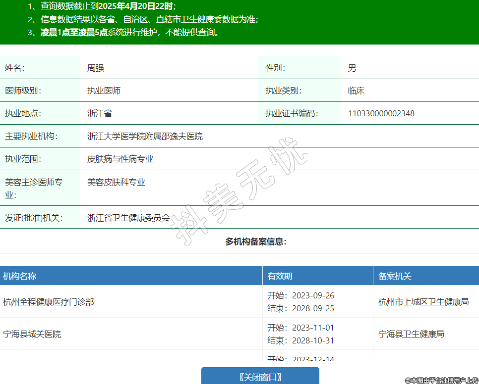 姓名:周強性別:男醫(yī)師級別:執(zhí)業(yè)醫(yī)師執(zhí)業(yè)類別:臨床執(zhí)業(yè)地點:浙江省執(zhí)業(yè)證書編碼:110330000002348主要執(zhí)業(yè)機構(gòu):浙江大學(xué)醫(yī)學(xué)院附屬邵逸夫醫(yī)院執(zhí)業(yè)范圍:皮膚病與性病專業(yè)美容主診醫(yī)師專業(yè):美容皮膚科專業(yè)發(fā)證(批準(zhǔn))機關(guān):浙江省衛(wèi)生健康委員會多機構(gòu)備案信息:機構(gòu)名稱 有效期 備案機關(guān) 杭州全程健康醫(yī)療門診部 開始:2023-09-26結(jié)束:2028-09-25杭州市上城區(qū)衛(wèi)生健康局 寧??h城關(guān)醫(yī)院 開始:2023-11-01結(jié)束:2028-10-31寧??h衛(wèi)生健康局 坤益(杭州)健康管理有限公司武林綜合門診部 開始:2023-12-14結(jié)束:2028-12-13杭州市拱墅區(qū)衛(wèi)生健康局 -