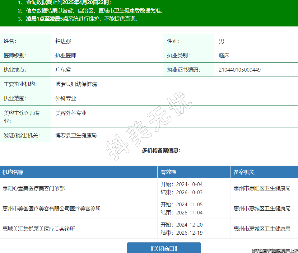 姓名:鐘達(dá)強(qiáng)性別:男醫(yī)師級(jí)別:執(zhí)業(yè)醫(yī)師執(zhí)業(yè)類(lèi)別:臨床執(zhí)業(yè)地點(diǎn):廣東省執(zhí)業(yè)證書(shū)編碼:210440105000449主要執(zhí)業(yè)機(jī)構(gòu):博羅縣婦幼保健院執(zhí)業(yè)范圍:外科專(zhuān)業(yè)美容主診醫(yī)師專(zhuān)業(yè):美容外科專(zhuān)業(yè)發(fā)證(批準(zhǔn))機(jī)關(guān):博羅縣衛(wèi)生健康局多機(jī)構(gòu)備案信息:機(jī)構(gòu)名稱(chēng) 有效期 備案機(jī)關(guān) 惠陽(yáng)心壹美醫(yī)療美容門(mén)診部 開(kāi)始:2024-10-04結(jié)束:2026-10-03惠州市惠陽(yáng)區(qū)衛(wèi)生健康局 惠州市美薈醫(yī)療美容有限公司醫(yī)療美容診所 開(kāi)始:2024-11-05結(jié)束:2026-11-04惠州市惠城區(qū)衛(wèi)生健康局 惠城美匯集悅?cè)R美醫(yī)療美容診所 開(kāi)始:2024-12-20結(jié)束:2026-12-19惠州市惠城區(qū)衛(wèi)生健康局 -