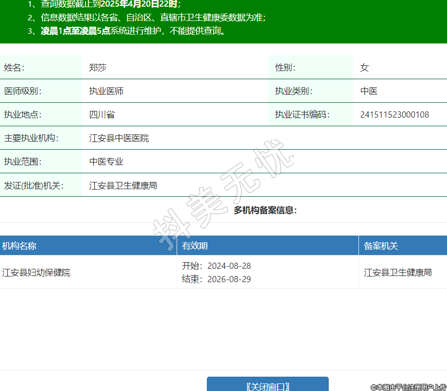 姓名:鄭莎性別:女醫(yī)師級(jí)別:執(zhí)業(yè)醫(yī)師執(zhí)業(yè)類別:中醫(yī)執(zhí)業(yè)地點(diǎn):四川省執(zhí)業(yè)證書編碼:241511523000108主要執(zhí)業(yè)機(jī)構(gòu):江安縣中醫(yī)醫(yī)院執(zhí)業(yè)范圍:中醫(yī)專業(yè)發(fā)證(批準(zhǔn))機(jī)關(guān):江安縣衛(wèi)生健康局多機(jī)構(gòu)備案信息:機(jī)構(gòu)名稱 有效期 備案機(jī)關(guān) 江安縣婦幼保健院 開(kāi)始:2024-08-28結(jié)束:2026-08-29江安縣衛(wèi)生健康局 -