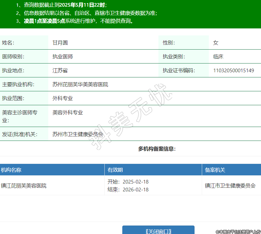 姓名:甘月圓性別:女醫(yī)師級別:執(zhí)業(yè)醫(yī)師執(zhí)業(yè)類別:臨床執(zhí)業(yè)地點:江蘇省執(zhí)業(yè)證書編碼:110320500015149主要執(zhí)業(yè)機構(gòu):蘇州芘麗芙華美美容醫(yī)院執(zhí)業(yè)范圍:外科專業(yè)美容主診醫(yī)師專業(yè):美容外科專業(yè)發(fā)證(批準)機關(guān):蘇州市衛(wèi)生健康委員會多機構(gòu)備案信息:機構(gòu)名稱 有效期 備案機關(guān) 鎮(zhèn)江芘麗芙美容醫(yī)院 開始:2025-02-18結(jié)束:2026-02-18鎮(zhèn)江市衛(wèi)生健康委員會 -