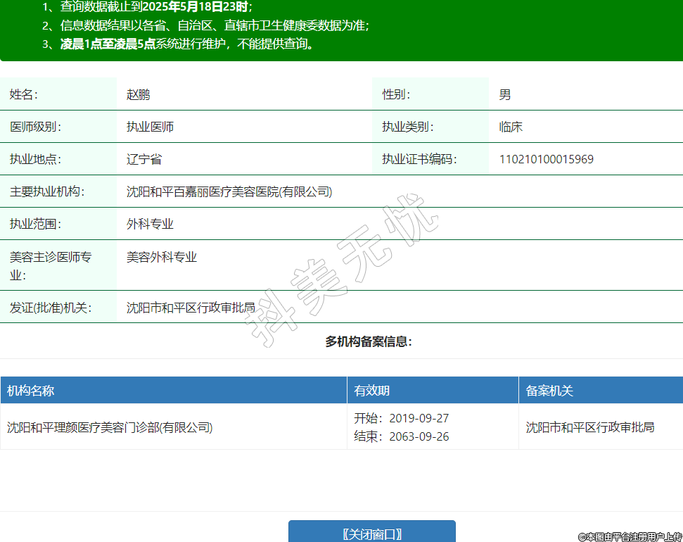 名:趙鵬性別:男醫(yī)師級別:執(zhí)業(yè)醫(yī)師執(zhí)業(yè)類別:臨床執(zhí)業(yè)地點(diǎn):遼寧省執(zhí)業(yè)證書編碼:110210100015969主要執(zhí)業(yè)機(jī)構(gòu):沈陽和平百嘉麗醫(yī)療美容醫(yī)院(有限公司)執(zhí)業(yè)范圍:外科專業(yè)美容主診醫(yī)師專業(yè):美容外科專業(yè)發(fā)證(批準(zhǔn))機(jī)關(guān):沈陽市和平區(qū)行政審批局多機(jī)構(gòu)備案信息:機(jī)構(gòu)名稱 有效期 備案機(jī)關(guān) 沈陽和平理顏醫(yī)療美容門診部(有限公司) 開始:2019-09-27結(jié)束:2063-09-26沈陽市和平區(qū)行政審批局 -