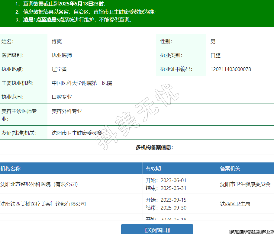 姓名:佟爽性別:男醫(yī)師級(jí)別:執(zhí)業(yè)醫(yī)師執(zhí)業(yè)類別:口腔執(zhí)業(yè)地點(diǎn):遼寧省執(zhí)業(yè)證書編碼:120211403000078主要執(zhí)業(yè)機(jī)構(gòu):中國(guó)醫(yī)科大學(xué)附屬第一醫(yī)院執(zhí)業(yè)范圍:口腔專業(yè)美容主診醫(yī)師專業(yè):美容外科專業(yè)發(fā)證(批準(zhǔn))機(jī)關(guān):沈陽市衛(wèi)生健康委員會(huì)多機(jī)構(gòu)備案信息:機(jī)構(gòu)名稱 有效期 備案機(jī)關(guān) 沈陽北方整形外科醫(yī)院(有限公司) 開始:2023-06-01結(jié)束:2025-05-31沈陽市衛(wèi)生健康委員會(huì) 沈陽鐵西美樹醫(yī)療美容門診部有限公司 開始:2023-09-15結(jié)束:2025-09-30鐵西區(qū)衛(wèi)生局 沈陽京沈醫(yī)院 開始:2024-05-18結(jié)束:2027-05-17沈陽市衛(wèi)生健康委員會(huì) 沈陽和平嘉華口腔門診部有限公司 開始:2024-07-17結(jié)束:2026-07-31沈陽市和平區(qū)行政審批局 沈陽市第四人民醫(yī)院 開始:2024-11-11結(jié)束:2026-11-10沈陽市衛(wèi)生健康委員會(huì) -
