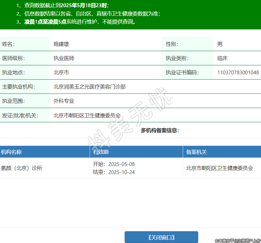 姓名:施建雄性別:男醫(yī)師級(jí)別:執(zhí)業(yè)醫(yī)師執(zhí)業(yè)類(lèi)別:臨床執(zhí)業(yè)地點(diǎn):北京市執(zhí)業(yè)證書(shū)編碼:110370783001048主要執(zhí)業(yè)機(jī)構(gòu):北京潤(rùn)美玉之光醫(yī)療美容門(mén)診部執(zhí)業(yè)范圍:外科專(zhuān)業(yè)發(fā)證(批準(zhǔn))機(jī)關(guān):北京市朝陽(yáng)區(qū)衛(wèi)生健康委員會(huì)多機(jī)構(gòu)備案信息:機(jī)構(gòu)名稱(chēng) 有效期 備案機(jī)關(guān) 氫顏(北京)診所 開(kāi)始:2025-05-08結(jié)束:2025-10-24北京市朝陽(yáng)區(qū)衛(wèi)生健康委員會(huì) -