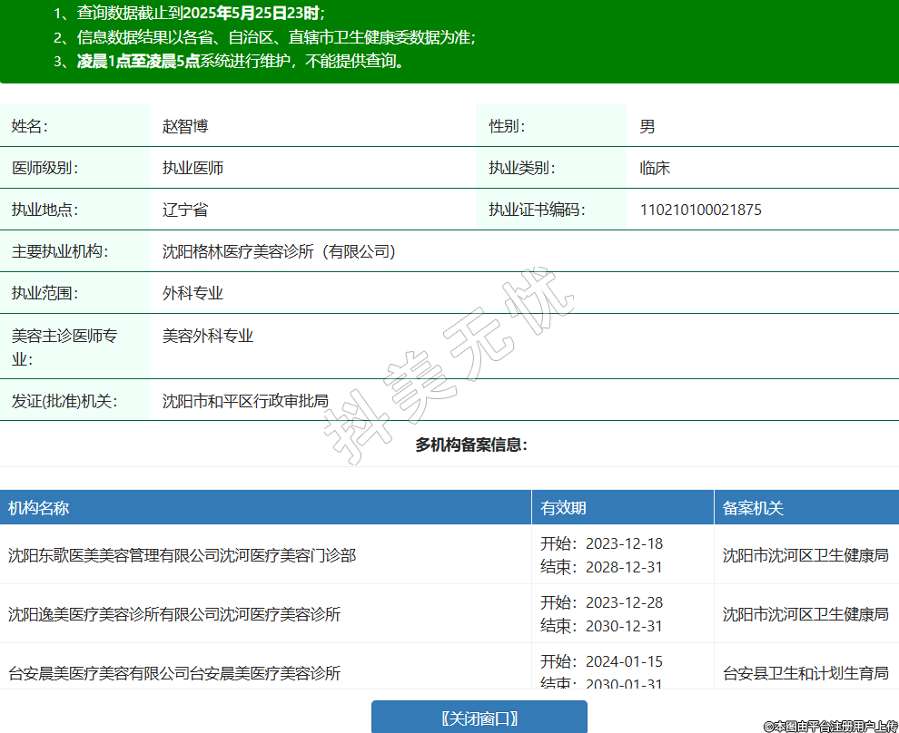 姓名:趙智博性別:男醫(yī)師級別:執(zhí)業(yè)醫(yī)師執(zhí)業(yè)類別:臨床執(zhí)業(yè)地點(diǎn):遼寧省執(zhí)業(yè)證書編碼:110210100021875主要執(zhí)業(yè)機(jī)構(gòu):沈陽格林醫(yī)療美容診所(有限公司)執(zhí)業(yè)范圍:外科專業(yè)美容主診醫(yī)師專業(yè):美容外科專業(yè)發(fā)證(批準(zhǔn))機(jī)關(guān):沈陽市和平區(qū)行政審批局多機(jī)構(gòu)備案信息:機(jī)構(gòu)名稱 有效期 備案機(jī)關(guān) 沈陽東歌醫(yī)美美容管理有限公司沈河醫(yī)療美容門診部 開始:2023-12-18結(jié)束:2028-12-31沈陽市沈河區(qū)衛(wèi)生健康局 沈陽逸美醫(yī)療美容診所有限公司沈河醫(yī)療美容診所 開始:2023-12-28結(jié)束:2030-12-31沈陽市沈河區(qū)衛(wèi)生健康局 臺(tái)安晨美醫(yī)療美容有限公司臺(tái)安晨美醫(yī)療美容診所 開始:2024-01-15結(jié)束:2030-01-31臺(tái)安縣衛(wèi)生和計(jì)劃生育局 鐵嶺依宸醫(yī)療美容咨詢有限公司美容診所 開始:2024-01-29結(jié)束:2030-12-31鐵嶺縣衛(wèi)生健康局 沈陽渾南藍(lán)樹醫(yī)療美容門診部(有限公司) 開始:2024-06-28結(jié)束:2027-12-31沈陽市渾南區(qū)衛(wèi)生健康局 沈陽微修堂醫(yī)療美容有限公司沈河南塔醫(yī)療美容診所 開始:2024-07-26結(jié)束:2030-12-31沈陽市沈河區(qū)衛(wèi)生健康局 沈陽嘉顏里醫(yī)療美容有限公司鐵西衛(wèi)工北街醫(yī)療美容診所 開始:2024-10-13結(jié)束:2030-10-31鐵西區(qū)衛(wèi)生局 沈陽和平瑪爾詩醫(yī)療美容診所(有限公司) 開始:2024-11-11結(jié)束:2030-12-31沈陽市和平區(qū)行政審批局 沈陽尚品頤醫(yī)療健康管理有限公司沈河尚品頤醫(yī)療美容診所 開始:2025-01-14結(jié)束:2030-12-13沈陽市沈河區(qū)衛(wèi)生健康局 沈陽慕僖醫(yī)療美容有限公司鐵西醫(yī)療美容診所 開始:2025-01-15結(jié)束:2030-12-31鐵西區(qū)衛(wèi)生局 -