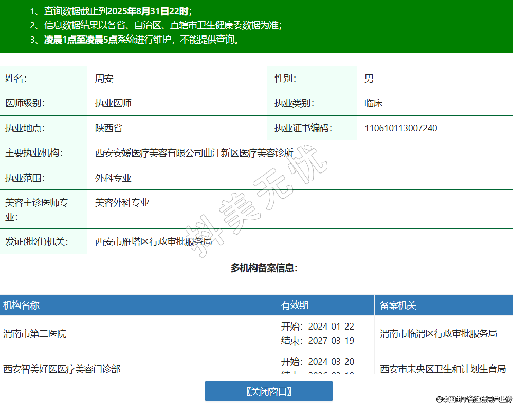 姓名:周安性別:男醫(yī)師級別:執(zhí)業(yè)醫(yī)師執(zhí)業(yè)類別:臨床執(zhí)業(yè)地點:陜西省執(zhí)業(yè)證書編碼:110610113007240主要執(zhí)業(yè)機(jī)構(gòu):西安安媛醫(yī)療美容有限公司曲江新區(qū)醫(yī)療美容診所執(zhí)業(yè)范圍:外科專業(yè)美容主診醫(yī)師專業(yè):美容外科專業(yè)發(fā)證(批準(zhǔn))機(jī)關(guān):西安市雁塔區(qū)行政審批服務(wù)局多機(jī)構(gòu)備案信息:機(jī)構(gòu)名稱 有效期 備案機(jī)關(guān) 渭南市第二醫(yī)院 開始:2024-01-22結(jié)束:2027-03-19渭南市臨渭區(qū)行政審批服務(wù)局 西安智美好醫(yī)醫(yī)療美容門診部 開始:2024-03-20結(jié)束:2026-03-19西安市未央?yún)^(qū)衛(wèi)生和計劃生育局 西安星容妍醫(yī)療科技有限責(zé)任公司曲江新區(qū)醫(yī)療美容診所 開始:2024-11-21結(jié)束:2025-11-20西安市雁塔區(qū)行政審批服務(wù)局 -