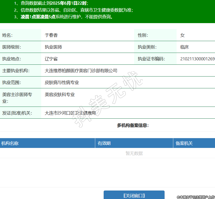 姓名:于春香性別:女醫(yī)師級(jí)別:執(zhí)業(yè)醫(yī)師執(zhí)業(yè)類別:臨床執(zhí)業(yè)地點(diǎn):遼寧省執(zhí)業(yè)證書編碼:210211300001269主要執(zhí)業(yè)機(jī)構(gòu):大連維恩柏顏醫(yī)療美容門診部有限公司執(zhí)業(yè)范圍:皮膚病與性病專業(yè)美容主診醫(yī)師專業(yè):美容皮膚科專業(yè)發(fā)證(批準(zhǔn))機(jī)關(guān):大連市沙河口區(qū)衛(wèi)生健康局 -