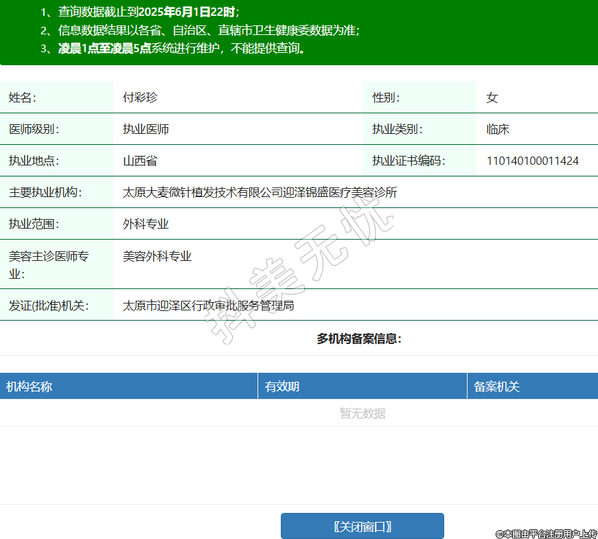 姓名:付彩珍性別:女醫(yī)師級別:執(zhí)業(yè)醫(yī)師執(zhí)業(yè)類別:臨床執(zhí)業(yè)地點:山西省執(zhí)業(yè)證書編碼:110140100011424主要執(zhí)業(yè)機構(gòu):太原大麥微針植發(fā)技術有限公司迎澤錦盛醫(yī)療美容診所執(zhí)業(yè)范圍:外科專業(yè)美容主診醫(yī)師專業(yè):美容外科專業(yè)發(fā)證(批準)機關:太原市迎澤區(qū)行政審批服務管理局 -