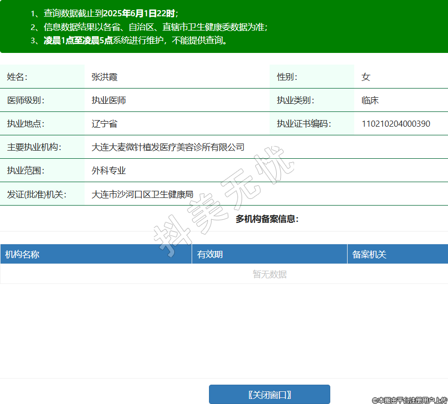 姓名:張洪霞性別:女醫(yī)師級(jí)別:執(zhí)業(yè)醫(yī)師執(zhí)業(yè)類別:臨床執(zhí)業(yè)地點(diǎn):遼寧省執(zhí)業(yè)證書編碼:110210204000390主要執(zhí)業(yè)機(jī)構(gòu):大連大麥微針植發(fā)醫(yī)療美容診所有限公司執(zhí)業(yè)范圍:外科專業(yè)發(fā)證(批準(zhǔn))機(jī)關(guān):大連市沙河口區(qū)衛(wèi)生健康局 -