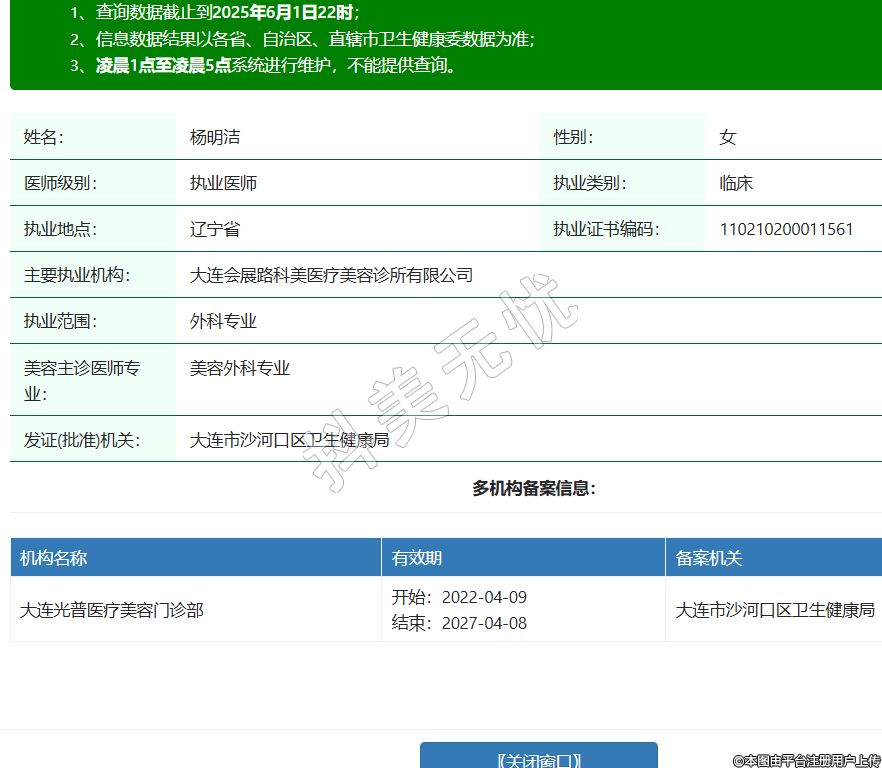 姓名:楊明潔性別:女醫(yī)師級別:執(zhí)業(yè)醫(yī)師執(zhí)業(yè)類別:臨床執(zhí)業(yè)地點(diǎn):遼寧省執(zhí)業(yè)證書編碼:110210200011561主要執(zhí)業(yè)機(jī)構(gòu):大連會展路科美醫(yī)療美容診所有限公司執(zhí)業(yè)范圍:外科專業(yè)美容主診醫(yī)師專業(yè):美容外科專業(yè)發(fā)證(批準(zhǔn))機(jī)關(guān):大連市沙河口區(qū)衛(wèi)生健康局多機(jī)構(gòu)備案信息:機(jī)構(gòu)名稱 有效期 備案機(jī)關(guān) 大連光普醫(yī)療美容門診部 開始:2022-04-09結(jié)束:2027-04-08大連市沙河口區(qū)衛(wèi)生健康局 -