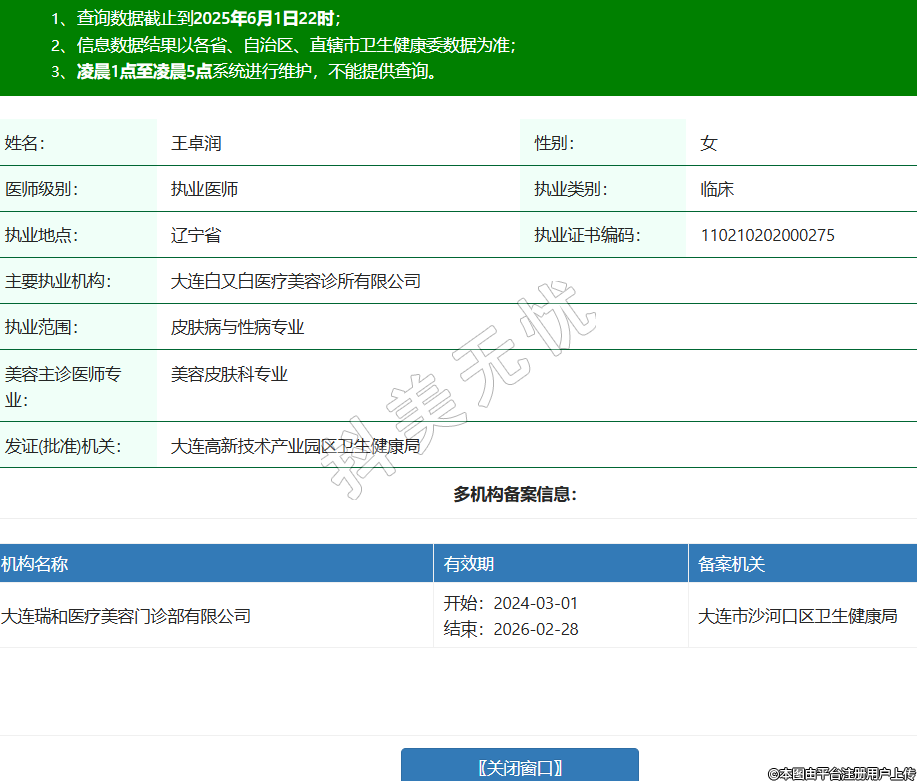 姓名:王卓潤性別:女醫(yī)師級別:執(zhí)業(yè)醫(yī)師執(zhí)業(yè)類別:臨床執(zhí)業(yè)地點(diǎn):遼寧省執(zhí)業(yè)證書編碼:110210202000275主要執(zhí)業(yè)機(jī)構(gòu):大連白又白醫(yī)療美容診所有限公司執(zhí)業(yè)范圍:皮膚病與性病專業(yè)美容主診醫(yī)師專業(yè):美容皮膚科專業(yè)發(fā)證(批準(zhǔn))機(jī)關(guān):大連高新技術(shù)產(chǎn)業(yè)園區(qū)衛(wèi)生健康局多機(jī)構(gòu)備案信息:機(jī)構(gòu)名稱 有效期 備案機(jī)關(guān) 大連瑞和醫(yī)療美容門診部有限公司 開始:2024-03-01結(jié)束:2026-02-28大連市沙河口區(qū)衛(wèi)生健康局 -