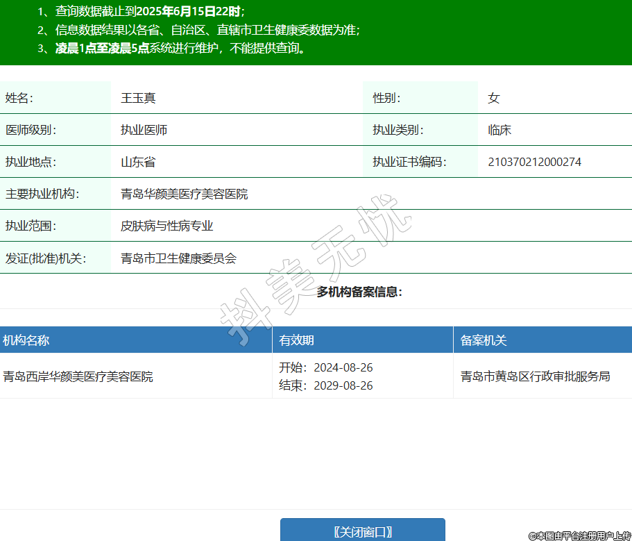 姓名:王玉真性別:女醫(yī)師級(jí)別:執(zhí)業(yè)醫(yī)師執(zhí)業(yè)類別:臨床執(zhí)業(yè)地點(diǎn):山東省執(zhí)業(yè)證書(shū)編碼:210370212000274主要執(zhí)業(yè)機(jī)構(gòu):青島華顏美醫(yī)療美容醫(yī)院執(zhí)業(yè)范圍:皮膚病與性病專業(yè)發(fā)證(批準(zhǔn))機(jī)關(guān):青島市衛(wèi)生健康委員會(huì)多機(jī)構(gòu)備案信息:機(jī)構(gòu)名稱 有效期 備案機(jī)關(guān) 青島西岸華顏美醫(yī)療美容醫(yī)院 開(kāi)始:2024-08-26結(jié)束:2029-08-26青島市黃島區(qū)行政審批服務(wù)局 -