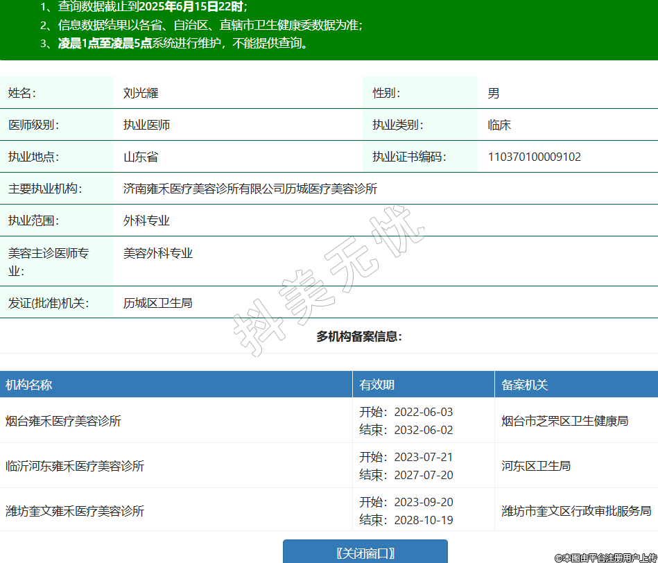 姓名:劉光耀性別:男醫(yī)師級(jí)別:執(zhí)業(yè)醫(yī)師執(zhí)業(yè)類別:臨床執(zhí)業(yè)地點(diǎn):山東省執(zhí)業(yè)證書(shū)編碼:110370100009102主要執(zhí)業(yè)機(jī)構(gòu):濟(jì)南雍禾醫(yī)療美容診所有限公司歷城醫(yī)療美容診所執(zhí)業(yè)范圍:外科專業(yè)美容主診醫(yī)師專業(yè):美容外科專業(yè)發(fā)證(批準(zhǔn))機(jī)關(guān):歷城區(qū)衛(wèi)生局多機(jī)構(gòu)備案信息:機(jī)構(gòu)名稱 有效期 備案機(jī)關(guān) 煙臺(tái)雍禾醫(yī)療美容診所 開(kāi)始:2022-06-03結(jié)束:2032-06-02煙臺(tái)市芝罘區(qū)衛(wèi)生健康局 臨沂河?xùn)|雍禾醫(yī)療美容診所 開(kāi)始:2023-07-21結(jié)束:2027-07-20河?xùn)|區(qū)衛(wèi)生局 濰坊奎文雍禾醫(yī)療美容診所 開(kāi)始:2023-09-20結(jié)束:2028-10-19濰坊市奎文區(qū)行政審批服務(wù)局 東營(yíng)雍禾醫(yī)療美容有限公司雍禾醫(yī)療美容診所 開(kāi)始:2023-10-17結(jié)束:2026-10-16東營(yíng)經(jīng)濟(jì)技術(shù)開(kāi)發(fā)區(qū)審批服務(wù)部 青島雍禾既美醫(yī)療美容有限公司市南醫(yī)療美容診所 開(kāi)始:2025-04-06結(jié)束:2030-05-06青島市市南區(qū)行政審批服務(wù)局 -