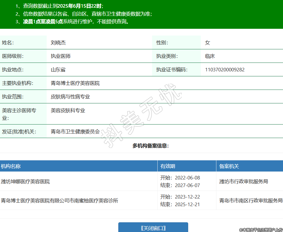 姓名:劉曉杰性別:女醫(yī)師級別:執(zhí)業(yè)醫(yī)師執(zhí)業(yè)類別:臨床執(zhí)業(yè)地點:山東省執(zhí)業(yè)證書編碼:110370200009282主要執(zhí)業(yè)機構(gòu):青島博士醫(yī)療美容醫(yī)院執(zhí)業(yè)范圍:皮膚病與性病專業(yè)美容主診醫(yī)師專業(yè):美容皮膚科專業(yè)發(fā)證(批準)機關(guān):青島市衛(wèi)生健康委員會多機構(gòu)備案信息:機構(gòu)名稱 有效期 備案機關(guān) 濰坊坤娜醫(yī)療美容醫(yī)院 開始:2022-06-08結(jié)束:2027-06-07濰坊市行政審批服務(wù)局 青島博士醫(yī)療美容醫(yī)院有限公司市南蜜柚醫(yī)療美容診所 開始:2023-12-22結(jié)束:2025-12-21青島市市南區(qū)行政審批服務(wù)局 -