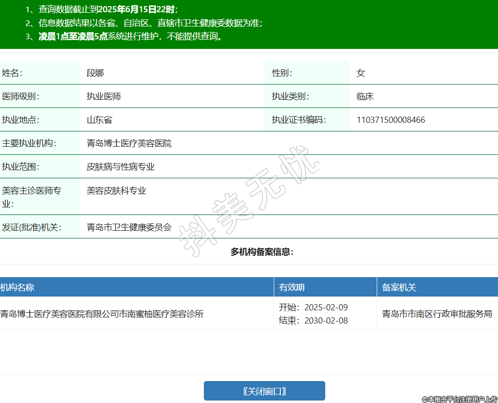 姓名:段娜性別:女醫(yī)師級別:執(zhí)業(yè)醫(yī)師執(zhí)業(yè)類別:臨床執(zhí)業(yè)地點:山東省執(zhí)業(yè)證書編碼:110371500008466主要執(zhí)業(yè)機構(gòu):青島博士醫(yī)療美容醫(yī)院執(zhí)業(yè)范圍:皮膚病與性病專業(yè)美容主診醫(yī)師專業(yè):美容皮膚科專業(yè)發(fā)證(批準(zhǔn))機關(guān):青島市衛(wèi)生健康委員會多機構(gòu)備案信息:機構(gòu)名稱 有效期 備案機關(guān) 青島博士醫(yī)療美容醫(yī)院有限公司市南蜜柚醫(yī)療美容診所 開始:2025-02-09結(jié)束:2030-02-08青島市市南區(qū)行政審批服務(wù)局 -