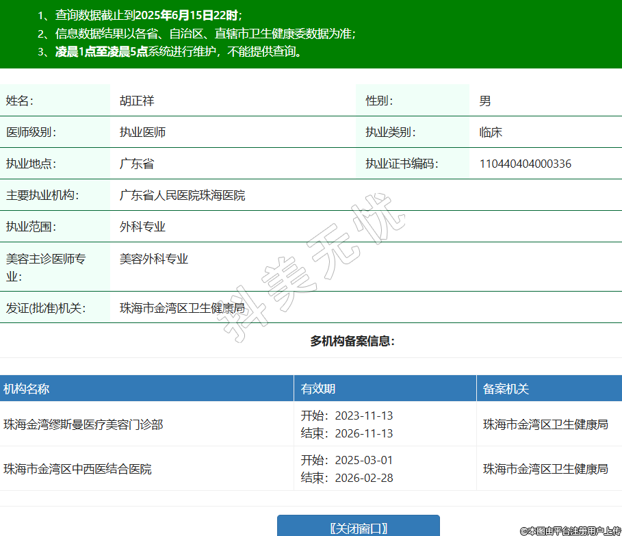 姓名:胡正祥性別:男醫(yī)師級別:執(zhí)業(yè)醫(yī)師執(zhí)業(yè)類別:臨床執(zhí)業(yè)地點:廣東省執(zhí)業(yè)證書編碼:110440404000336主要執(zhí)業(yè)機構(gòu):廣東省人民醫(yī)院珠海醫(yī)院執(zhí)業(yè)范圍:外科專業(yè)美容主診醫(yī)師專業(yè):美容外科專業(yè)發(fā)證(批準)機關(guān):珠海市金灣區(qū)衛(wèi)生健康局多機構(gòu)備案信息:機構(gòu)名稱 有效期 備案機關(guān) 珠海金灣繆斯曼醫(yī)療美容門診部 開始:2023-11-13結(jié)束:2026-11-13珠海市金灣區(qū)衛(wèi)生健康局 珠海市金灣區(qū)中西醫(yī)結(jié)合醫(yī)院 開始:2025-03-01結(jié)束:2026-02-28珠海市金灣區(qū)衛(wèi)生健康局 -