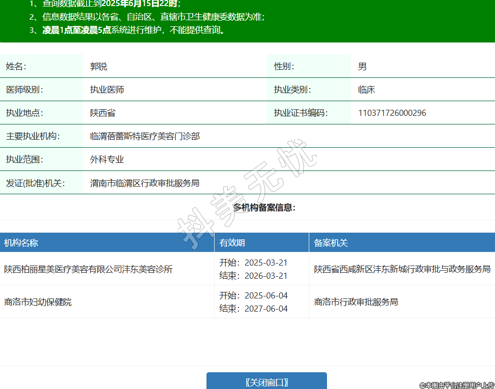 姓名:郭銳性別:男醫(yī)師級別:執(zhí)業(yè)醫(yī)師執(zhí)業(yè)類別:臨床執(zhí)業(yè)地點:陜西省執(zhí)業(yè)證書編碼:110371726000296主要執(zhí)業(yè)機構(gòu):臨渭蓓蕾斯特醫(yī)療美容門診部執(zhí)業(yè)范圍:外科專業(yè)發(fā)證(批準)機關(guān):渭南市臨渭區(qū)行政審批服務(wù)局多機構(gòu)備案信息:機構(gòu)名稱 有效期 備案機關(guān) 陜西柏麗星美醫(yī)療美容有限公司灃東美容診所 開始:2025-03-21結(jié)束:2026-03-21陜西省西咸新區(qū)灃東新城行政審批與政務(wù)服務(wù)局 商洛市婦幼保健院 開始:2025-06-04結(jié)束:2027-06-04商洛市行政審批服務(wù)局 -