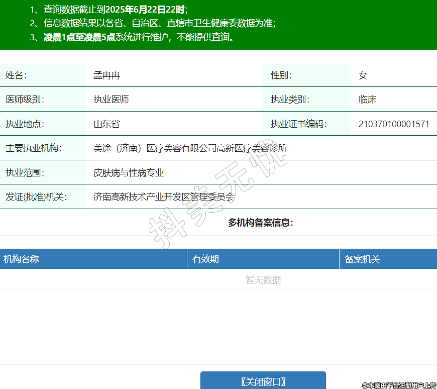 姓名:孟冉冉性別:女醫(yī)師級別:執(zhí)業(yè)醫(yī)師執(zhí)業(yè)類別:臨床執(zhí)業(yè)地點:山東省執(zhí)業(yè)證書編碼:210370100001571主要執(zhí)業(yè)機構(gòu):美途(濟南)醫(yī)療美容有限公司高新醫(yī)療美容診所執(zhí)業(yè)范圍:皮膚病與性病專業(yè)發(fā)證(批準(zhǔn))機關(guān):濟南高新技術(shù)產(chǎn)業(yè)開發(fā)區(qū)管理委員會 -