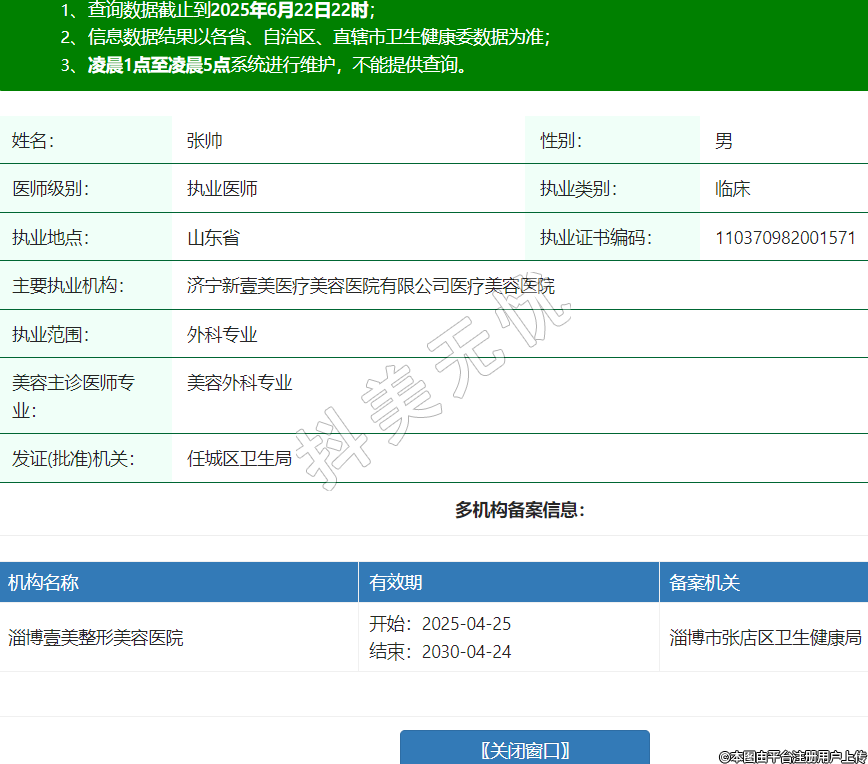 姓名:張帥性別:男醫(yī)師級(jí)別:執(zhí)業(yè)醫(yī)師執(zhí)業(yè)類(lèi)別:臨床執(zhí)業(yè)地點(diǎn):山東省執(zhí)業(yè)證書(shū)編碼:110370982001571主要執(zhí)業(yè)機(jī)構(gòu):濟(jì)寧新壹美醫(yī)療美容醫(yī)院有限公司醫(yī)療美容醫(yī)院執(zhí)業(yè)范圍:外科專(zhuān)業(yè)美容主診醫(yī)師專(zhuān)業(yè):美容外科專(zhuān)業(yè)發(fā)證(批準(zhǔn))機(jī)關(guān):任城區(qū)衛(wèi)生局多機(jī)構(gòu)備案信息:機(jī)構(gòu)名稱(chēng) 有效期 備案機(jī)關(guān) 淄博壹美整形美容醫(yī)院 開(kāi)始:2025-04-25結(jié)束:2030-04-24淄博市張店區(qū)衛(wèi)生健康局 -