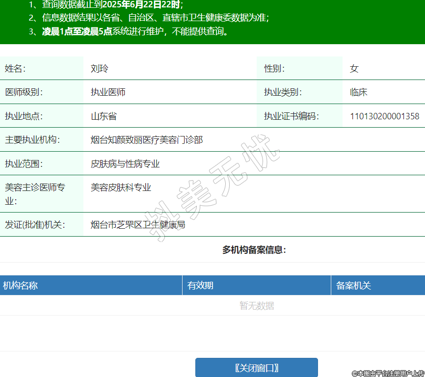 姓名:劉玲性別:女醫(yī)師級(jí)別:執(zhí)業(yè)醫(yī)師執(zhí)業(yè)類別:臨床執(zhí)業(yè)地點(diǎn):山東省執(zhí)業(yè)證書編碼:110130200001358主要執(zhí)業(yè)機(jī)構(gòu):煙臺(tái)知顏致麗醫(yī)療美容門診部執(zhí)業(yè)范圍:皮膚病與性病專業(yè)美容主診醫(yī)師專業(yè):美容皮膚科專業(yè)發(fā)證(批準(zhǔn))機(jī)關(guān):煙臺(tái)市芝罘區(qū)衛(wèi)生健康局 -